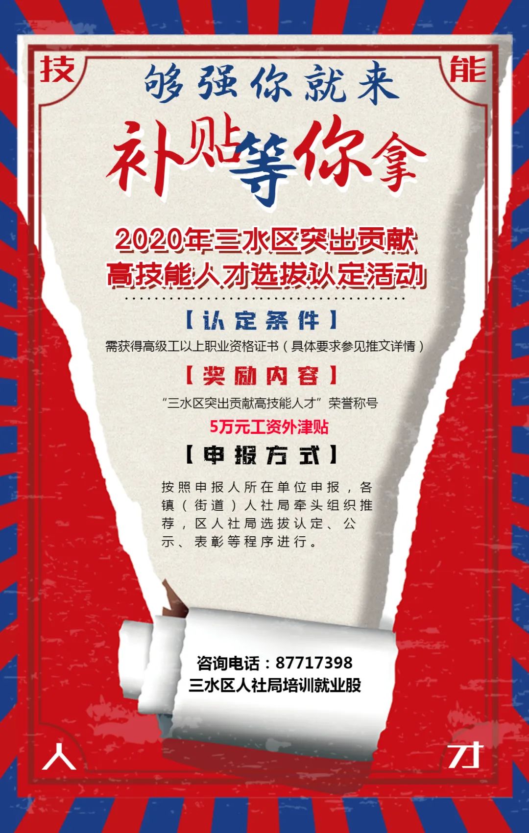 为加大高技能人才表彰激励力度,激发广大劳动者学习技能的热情,营造劳动光荣、崇尚技能、尊重高技能人才的良好社会氛围,促进我区产业转型升级、经济社会更好发展,我局决定开展2020年佛山市三水区突出贡献高技能人才选拔认定活动。