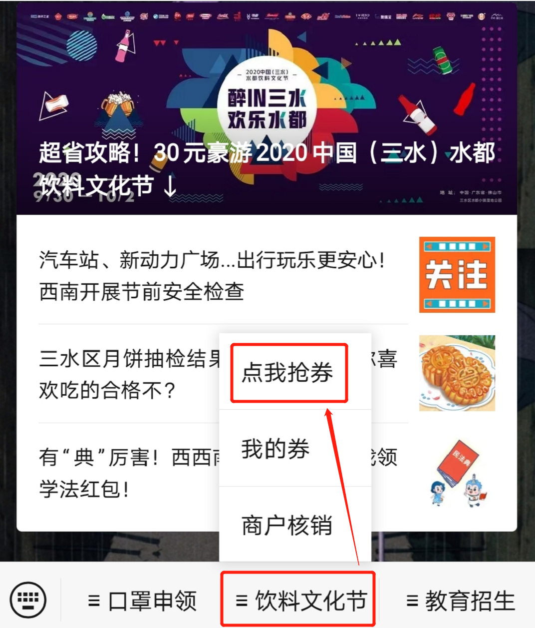 市民朋友可关注“水韵西南”微信公众号,在活动规定时间内进入公众号首页,通过点击【饮料文化节】栏中【点我抢券】领取。