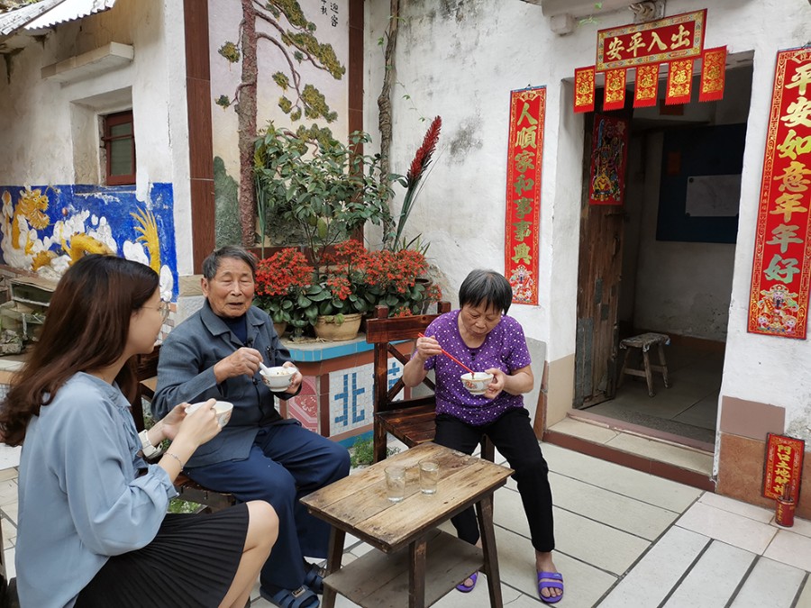 在独树岗村,97岁的独树岗村村民蔡赞显正给粉葛削皮,而他的妻子,94岁的卢润玲则在淘米煮饭。恰逢周末,恰逢儿孙从外地赶回来看望两位老人。蔡老夫妇一大早就忙着准备饭餐。几经忙碌,蔡赞显和卢润玲笑得格外灿烂。