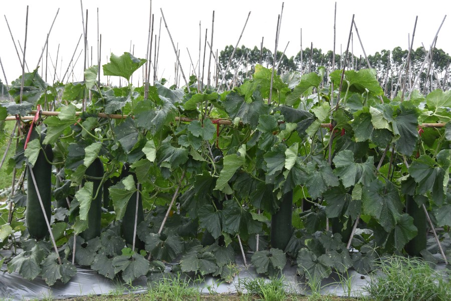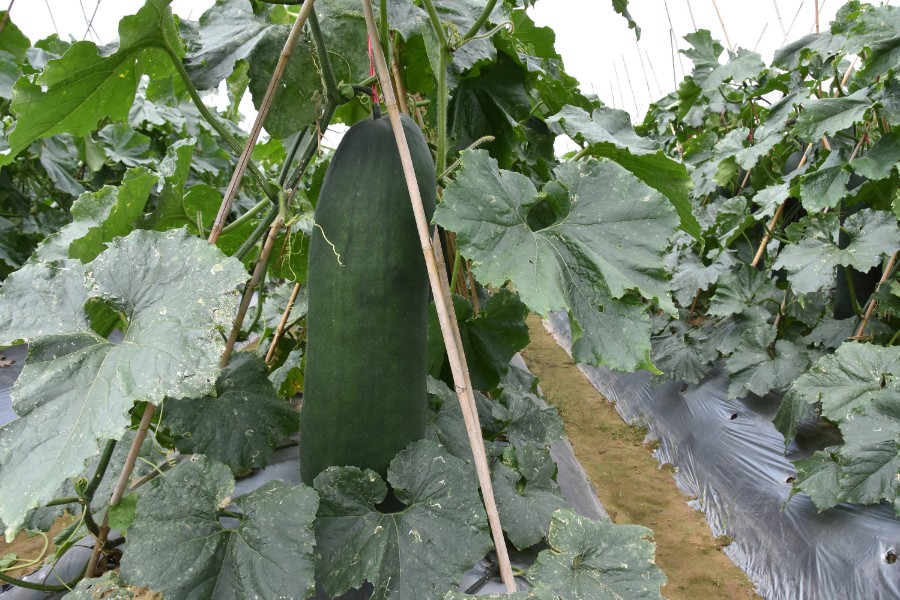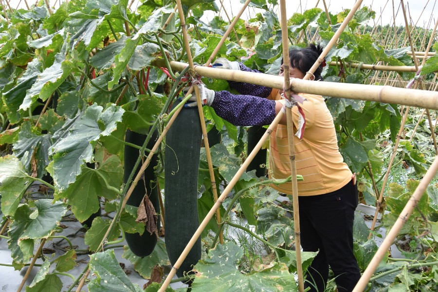 在上塘卢院村,黑皮冬瓜种植地上,一个个黑皮冬瓜色泽鲜明,均匀地挂在架上,长势非常好。瓜农正穿梭在瓜棚间,仔细地检查管理即将收成上市的冬瓜。