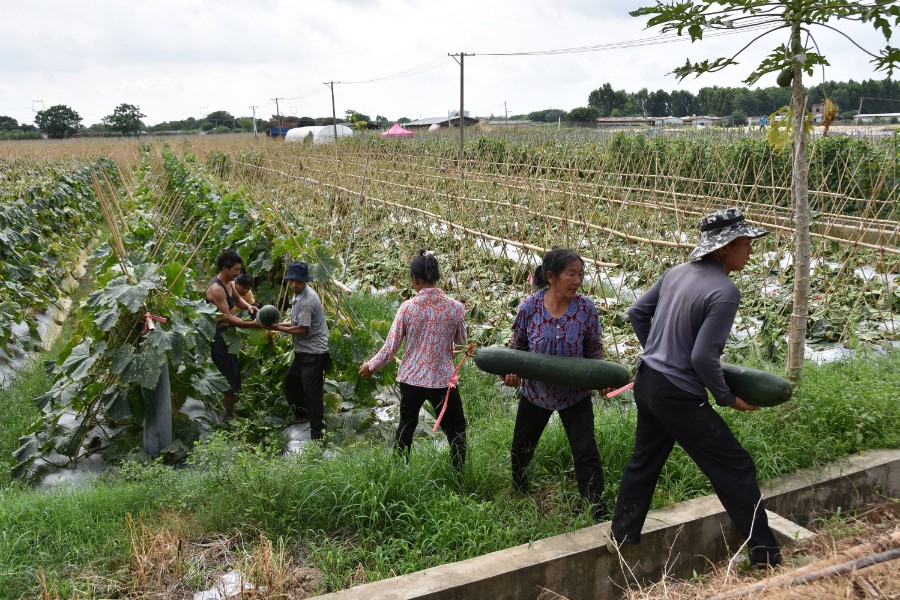 而在四联沙墩村,眼前这片一望无际的黑皮冬瓜种植地迎来丰收,冬瓜长势很好,已经吸引不少收购商前来下单、收购。只见一个个表皮光滑、瓜形硕大的黑皮冬瓜悬挂在藤蔓下,村民们穿梭其间忙着采摘、搬运这硕大的黑皮冬瓜,忙碌的身影传递着丰收的喜悦。