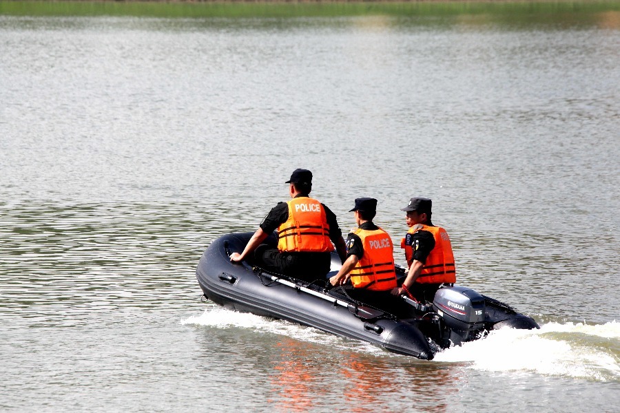 佛山市公安局三水公安巡警大队水警中队冲锋舟在东平水道水域巡逻时,发现一艘非法改装的大马力快艇正往四会方向高速航行,水警队员迅速前往查缉。