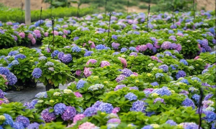 每逢春暖花开之时,佛山市高明区大布村的花卉种植基地便是一派生机勃勃的景象。绣球花海绽放,蓝粉相见,娇艳灵动。