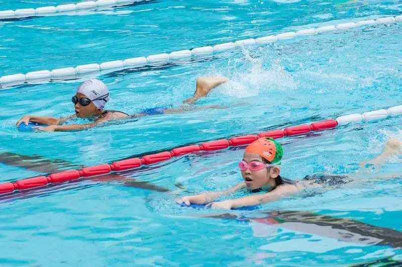 “双减”政策下,孩子们的周末开始越发充实,许多小朋友利用周末培养兴趣爱好,西南街道一露天游泳池内,两位小朋友正在游泳。 佛山日报记者王澍摄
