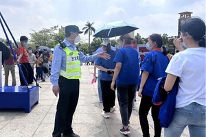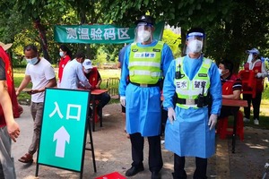 下午13时,气温高达32℃,烈日当头,穿着隔离衣的警辅人员早已汗流浃背,全身湿透,脸上闷出红印,但他们仍坚守岗位,无惧烈日,与全淼城群众一同齐心抗疫。