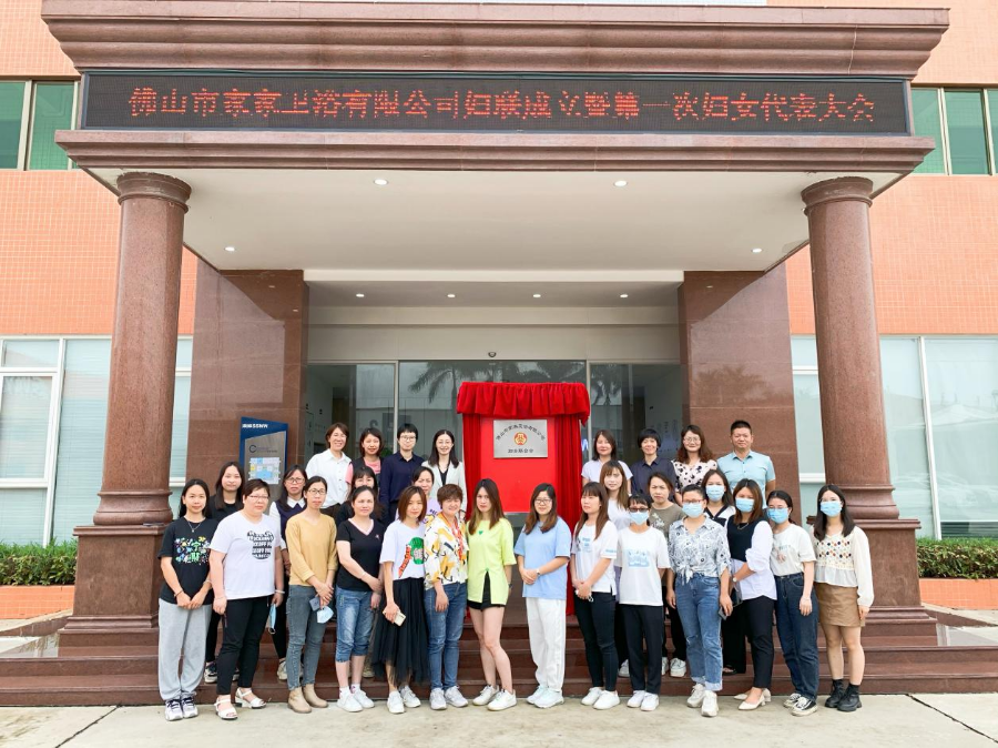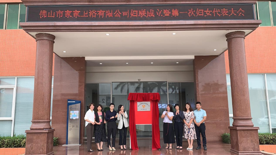 区、镇妇联及佛山市家家卫浴有限公司领导、新当选妇联主席、副主席一同为“四新”领域妇联揭牌。
