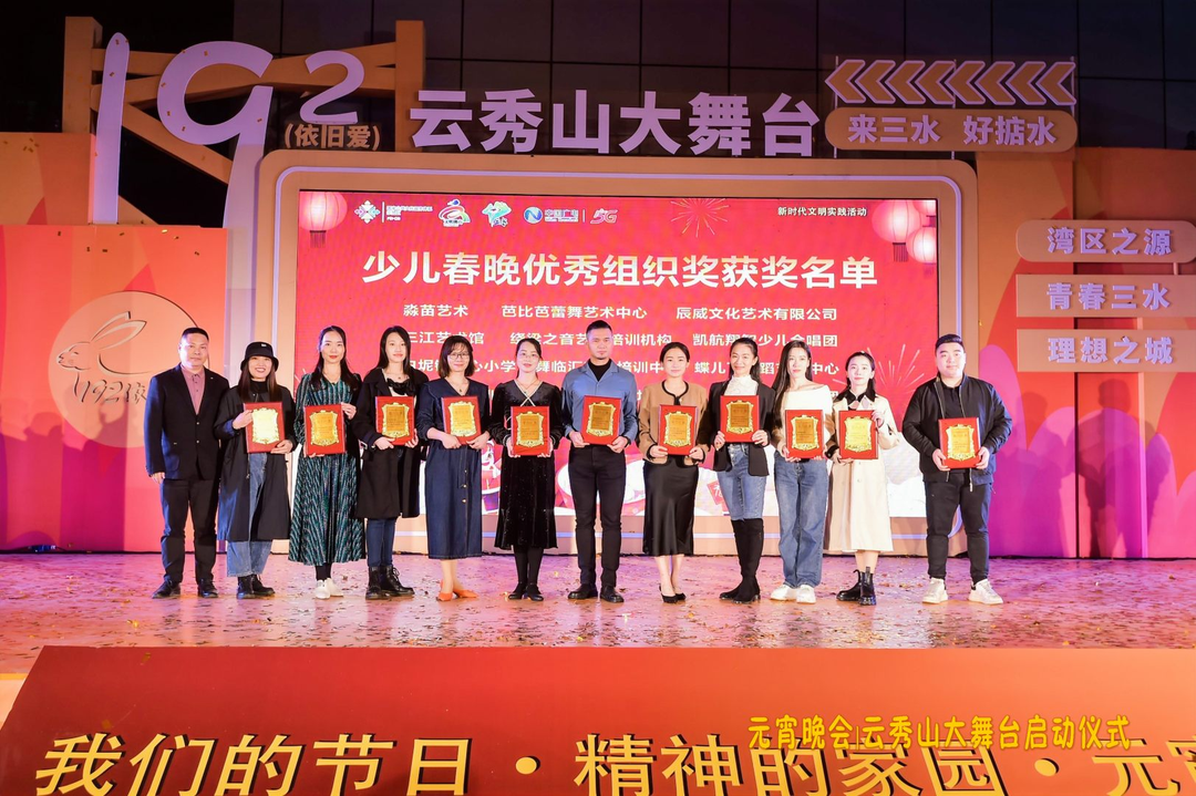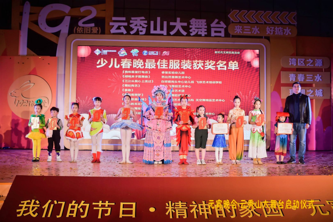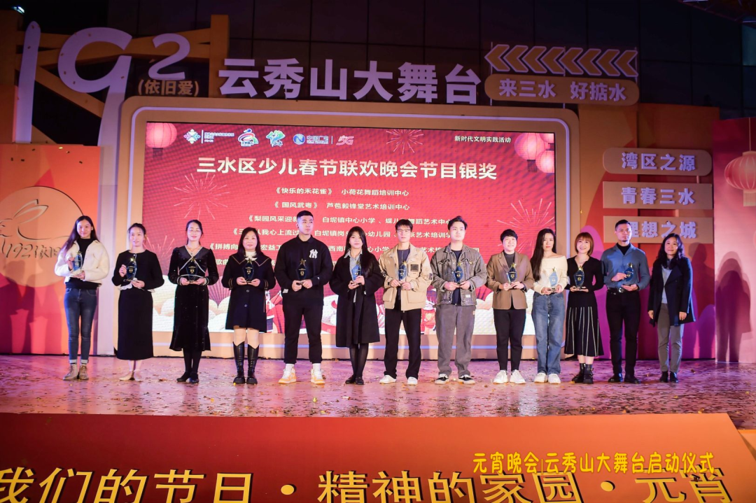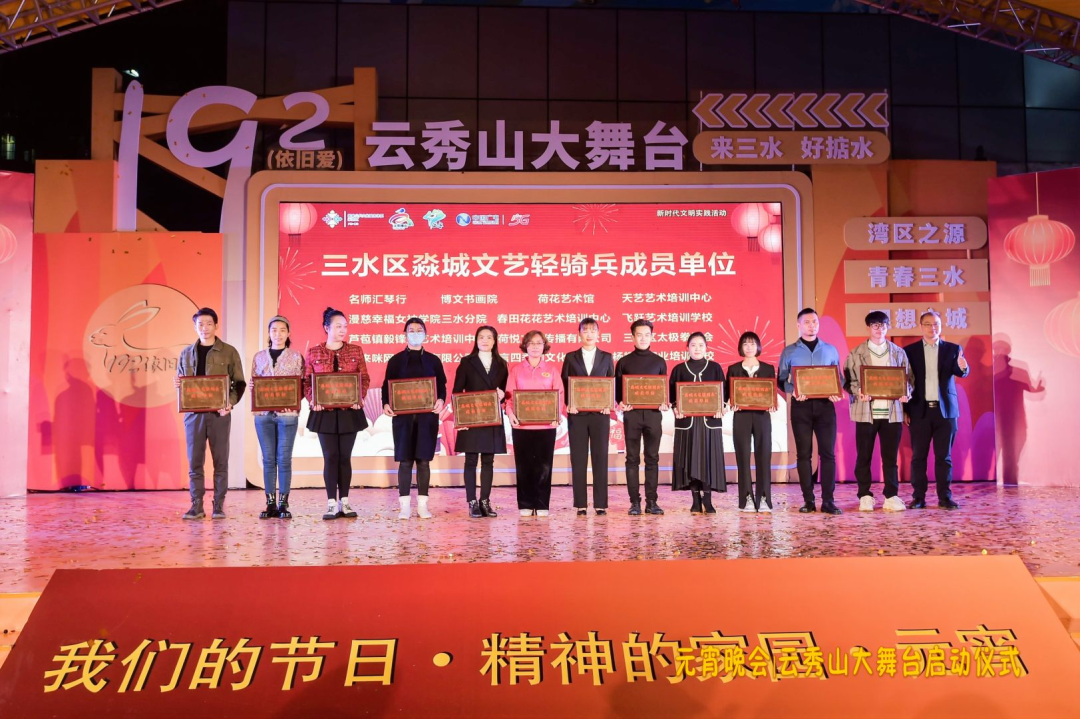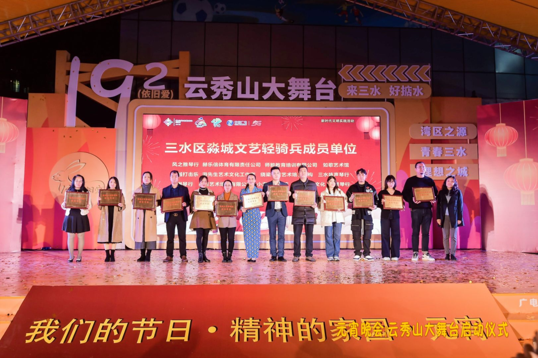本次活动的表演嘉宾全部来自“淼城文艺轻骑兵”,这是一支由文联下属各协会成员、区内热心企业、热心艺术培训机构、各类社会艺术人才及淼城之声合唱团、淼粉舞蹈团、少儿艺术团等团体联合组建的志愿队伍,除了会参与“云秀山大舞台”演出外,还将加入公益艺术培训品牌“淼城夜校”的共建共享。目前,已明确可以提供公益课程12次以上或参加云秀山大舞台表演5次以上的机构共52个,个人62人,所有参加的机构或个人全部是自愿参加、志愿形式,充分激发了公共文化服务的活性。活动为“淼城文艺轻骑兵”的机构、个人代表进行了颁牌仪式,并对三水少儿春晚获奖演员、组织进行了颁奖。