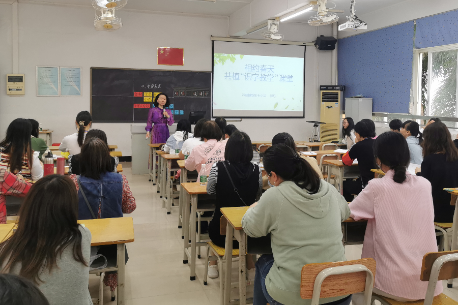 精彩的课例展示结束后,三水区优秀教师何丹老师以《相约春天 共植“识字教学”课堂》为题作经验分享。她结合教学现状与大家从“形声字归类识字”、“反义词对比识字”、“量词归类识字”三方面来谈归类识字课堂如何更高效、更有趣。佛山市优秀教师陈晓红老师则根据课程标准“低年段要注重培养学生学习汉字的兴趣,有主动识字的愿望。教学过程中加强字的音、形、义、用之间的联系。识字时要强调整体认识、注意不同板块识字的”的要求,结合自身识字教学的经验与思考,作了题为《识字有法 趣在其中》的分享,对低年段学生认字特点提出多个教学建议。