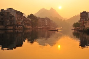 镇远的山水秀丽、生态宜人。著名词作家乔羽先生曾在镇远写下“也曾舞阳泛轻舟、青山妩媚水温柔”的诗句,国家级风景名胜区氵舞阳河,以峡谷秀水为主体,有险峡、奇峰、怪石、瀑布等令人叫绝的迷人胜景40余处;全国农业旅游示范点--铁溪景区,水流清澈见底,浅滩、溶洞星落棋布,一派小桥流水人家的景象;森林康养示范基地--高过河,原始森林古树参天,激情漂流奇幻刺激,被誉为一条会唱歌的河。