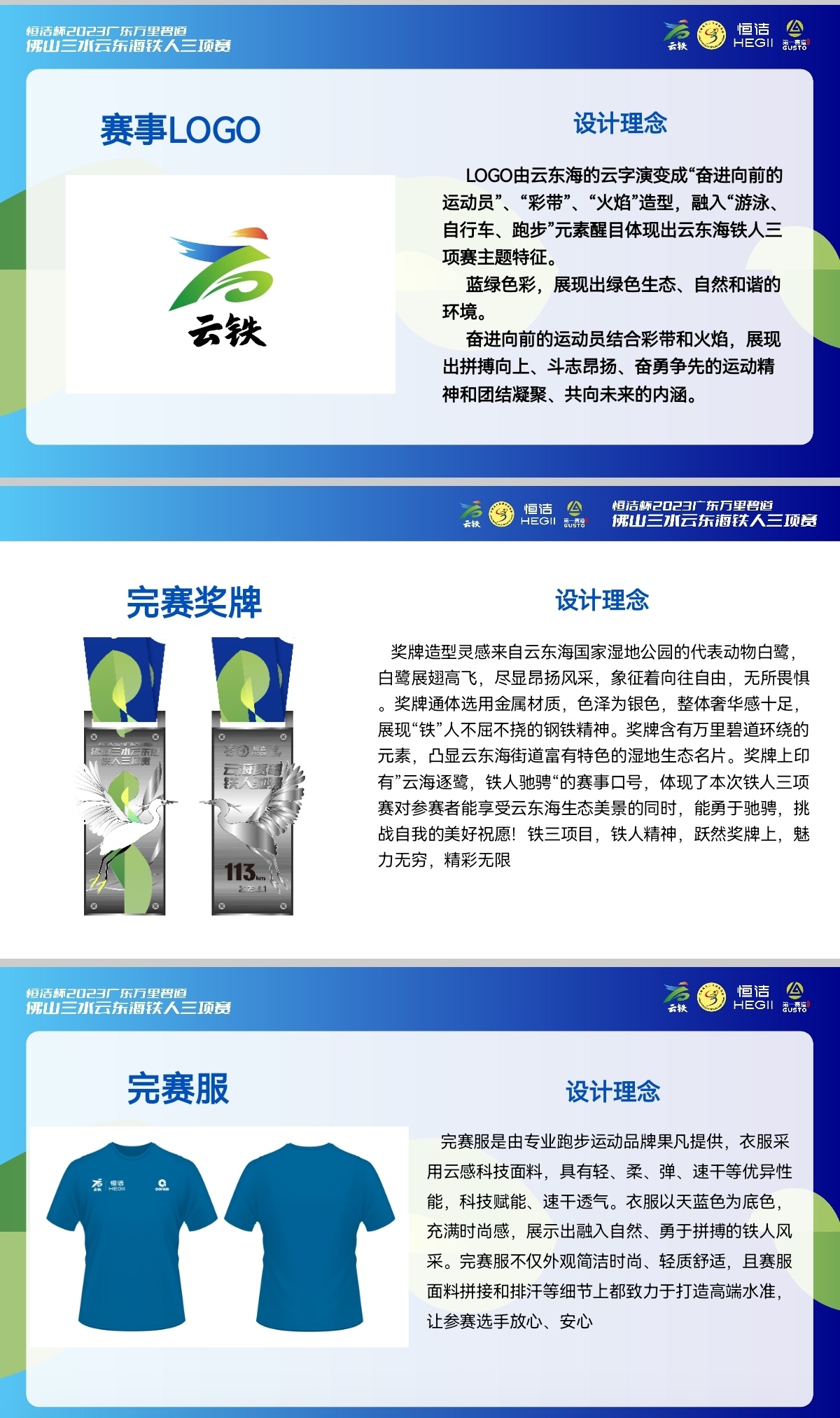 奖牌通体选用金属材质,色泽为银色,展现“铁”人不屈不挠的钢铁精神。奖牌含有万里碧道环绕的元素,凸显云东海街道富有特色的湿地生态名片。奖牌上还印有“云海逐鹭,铁人驰骋”的赛事口号,体现了本次铁人三项赛对参赛者能享受云东海生态美景的同时,能勇于驰骋,挑战自我的美好祝愿。