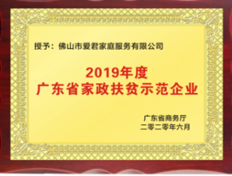 2019年,爱君家政公司荣获“佛山市家庭服务业(家政服务)优质品牌企业”、“广东省家政服务示范企业”“广东省家政扶贫示范企业”“广东省家政就业带头人”等荣誉。2020年荣获“南粤家政”省级家政服务龙头企业荣誉称号,成为佛山唯一上榜企业,2021年又获佛山市家政服务龙头企业称号。2023年荣获广东省“专精特新”企业、广东省“创新型”企业称