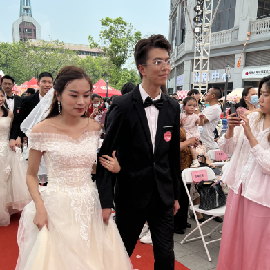 当启动仪式落下帷幕,20对新人在婉转动听的歌声中相互携手,穿过喷泉,依次登上舞台,为整个集体婚礼注入了甜蜜的氛围。