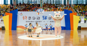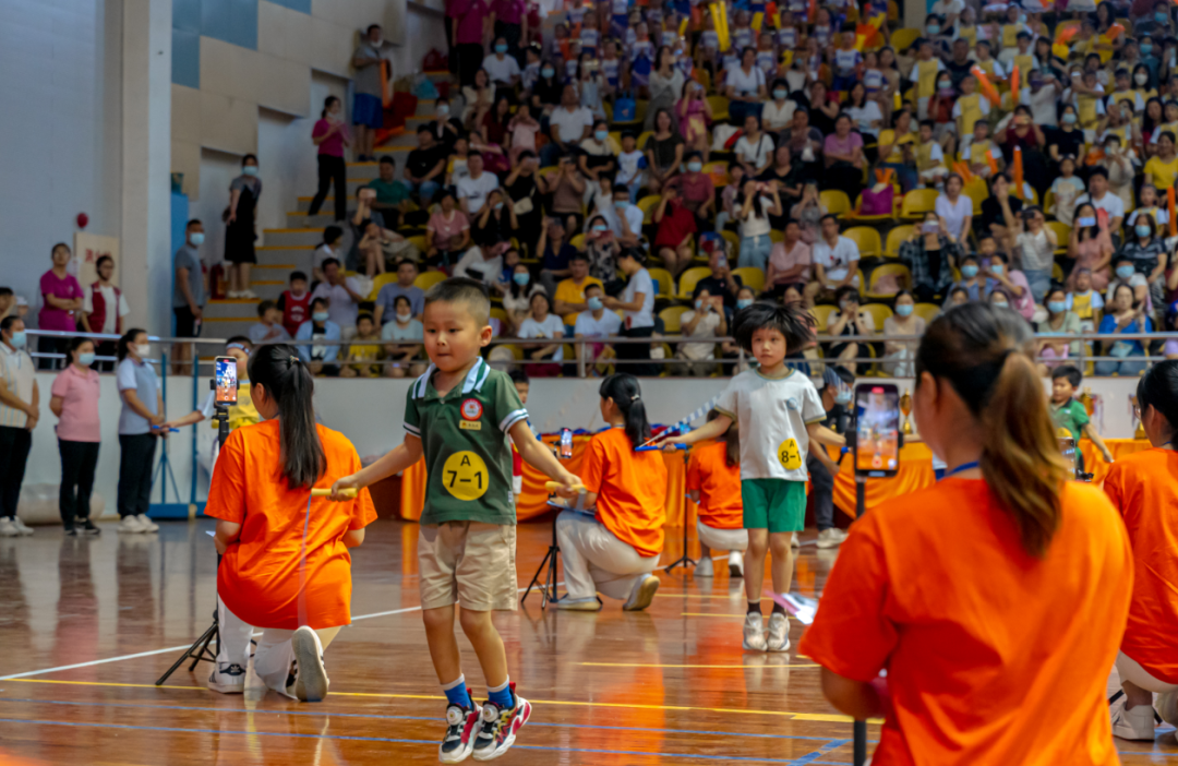 “幼儿1分钟跳”,比赛项目由孩子独立完成,需使用单摇跳(动作不限制)的方式完成动作,累积过绳成功次数为应得的次数。随着比赛音乐声响,全场一百多名孩子快速挥动手中彩绳,灵动起落的脚步,协调有力的动作展示了孩子们的健康活力和良好的身体素质。