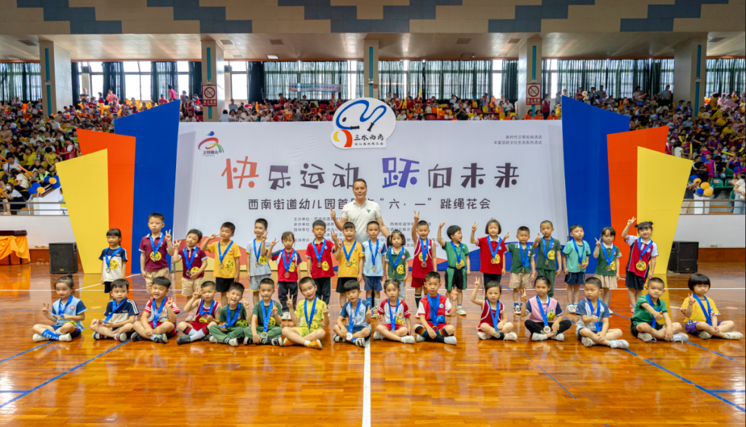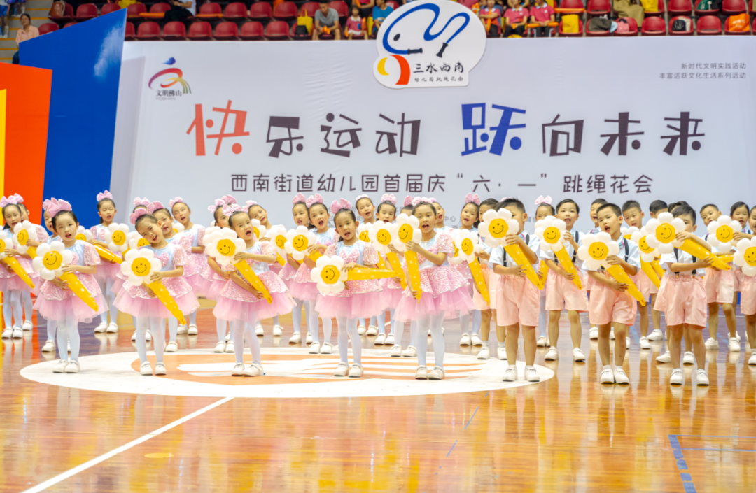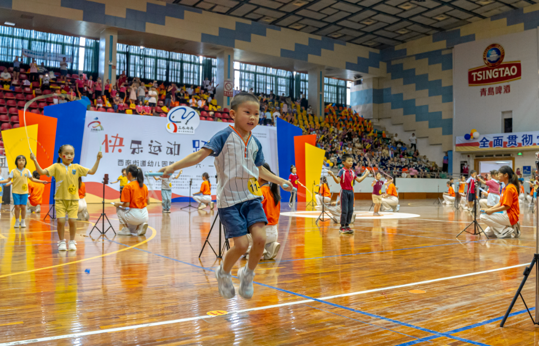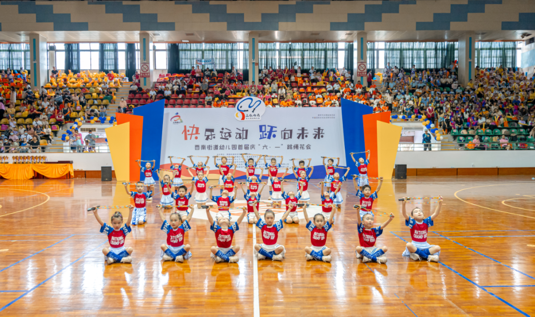 今天上午,西南街道幼儿园首届庆“六·一”跳绳花会暨第十二个学前教育宣传月活动在明富昌体育馆举行。西南街道43所幼儿园教师、幼儿和家长参加了活动,热闹非凡,盛况空前。