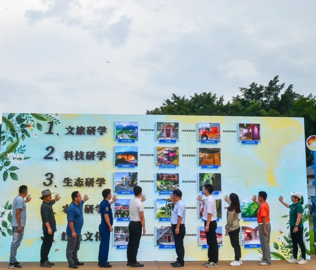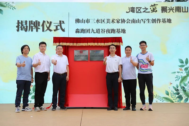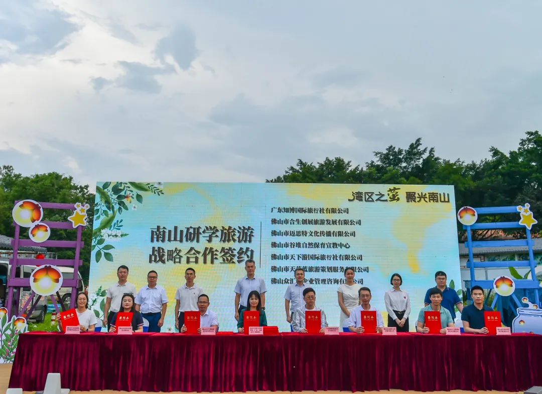 △ 现场还进行了佛山市三水区美术家协会写生创作基地揭牌、淼跑团夜营基地成立揭牌仪式,为九道谷旅游资源注入新活力。从小小萤火虫到蓬勃发展的夜光经济,南山镇在文旅资源深度发掘方面狠下功夫。不仅推出以“生态、科技、农旅、文旅、红色文化”为主题的研学路线,助力南山镇全面开发研学旅游路线,将研学教育、亲子旅游打造文旅产业的新亮点;还开启南山镇国资与多家大湾区研学机构(旅行社)的战略合作之旅,将为南山镇构建“全域全景+特色驱动+农文旅融合”的全域旅游发展模式,递出湾区文旅小镇名片。△ 现场举行南山镇研学旅游线路发布仪式,南山镇国资(兴农文旅)与研学机构(旅行社)签署战略合作协议。