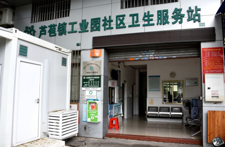 ▲芦苞工业园社区卫生站门口左侧放置有AED心脏急救设备。
