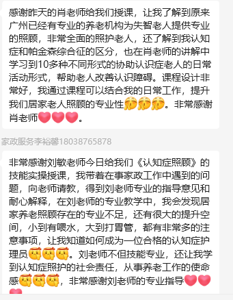 课后学员们反馈培训内容丰富实用、落地性强,干货满满,受益良多。学员纷纷表示非常感谢市人社局、区人社局、佛山市“南粤家政”产业园为大家搭建的学习平台及导师团队辛勤的付出、用心地培育。