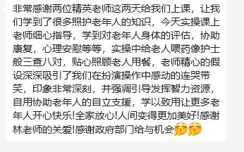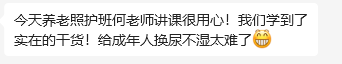 1.老年照护师培训班:采取理实一体化的培训模式,让学员在理论知识学习基础上进行操作巩固,其课程内容涵盖了饮食照护、清洁照护、排泄照护、转移照护、常见疾病照护、管道照护、居家应急处理、心理照护等。培训过程中,导师不断鼓励学员带着问题去思考、去实践,并为学员有针对性的进行指导,逐个突破,不仅提高了学员的专业技能知识、照护和沟通技能的应用能力,还提升学员的综合服务素养。