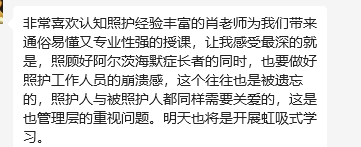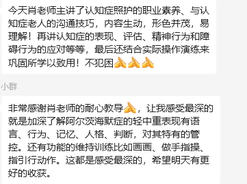 2.认知症照护师培训班课程:通过运用“启发式照护思维”方式,以“致力于解决现场照护难题”为培训目标,采用理论结合实际场景,综合运用案例分析、情景模拟实践等多种教学方法,深入浅出地讲解面对认知症群体不一样的照护理念,以及各种照护问题发生的原因和应对技巧。学员们专注学习,积极互动,分享实际工作中的感受和困惑,课堂氛围十分活跃!