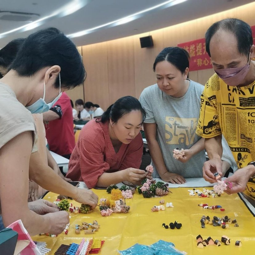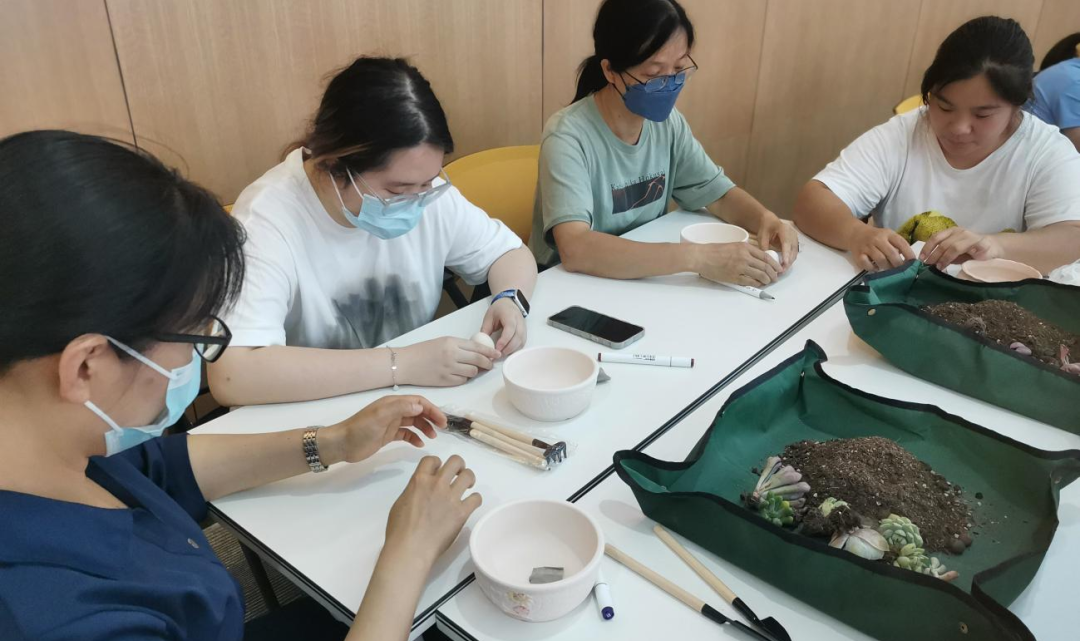 其次,邓老师以多肉植物微景观制作为主题,让家政服务人员通过自己动手种植多肉盆景,放松心情,感受大自然带来的快乐。在制作现场家政服务人员双手碰触泥土,放空心情烦恼,选好自己喜欢的多肉和装饰,轻松造景。大家都很投入,途中还不时发出欢笑声。