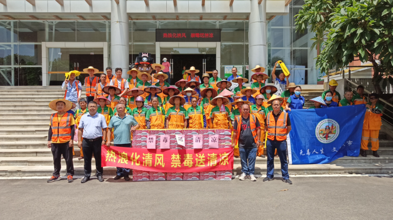 7月25日,芦苞镇禁毒办和启明星驿站携手镇综合治理办、镇公共服务办(卫健)在镇文化活动中心开展禁毒送清凉主题活动,为三水区国瀚城市服务有限公司芦苞服务部的环卫工人们送上义诊服务和清凉饮品,同时加大毒品预防宣传教育的覆盖面,提高群众识毒、防毒、拒毒意识,合力抗击高温,守护健康。