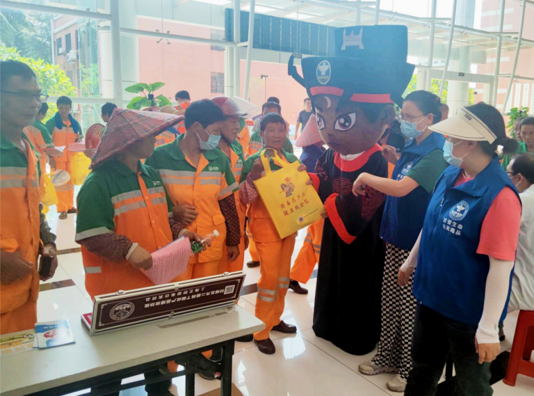 在一旁,镇社区卫生服务中心的医护人员为环卫工人们现场听诊、测量血压,耐心询问既往病史、回答疑问并积极宣传“夏季防中暑知识”,让现场环卫工人们收获实用的防暑清凉小技巧。同时镇综治办工作人员也为正在等待义诊的工人们送上扫黑、反诈知识大餐,告诫大家务必提高警惕,积极举报黑恶势力,不贪图蝇头小利,不给黑恶分子、诈骗分子一丝一毫机会。