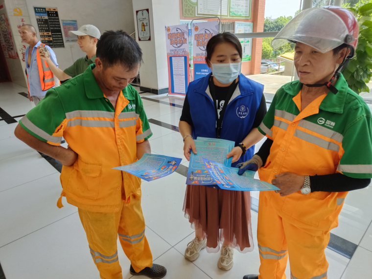 ▲工作人员向环卫工人宣传禁毒、扫黑除恶、反诈等相关知识。