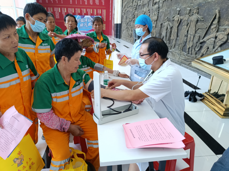 ▲义诊现场,医护人员为环卫工人测量血压,耐心回答疑问并积极宣传“夏季防中暑知识”。