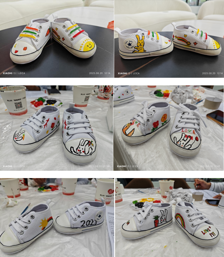 课程结束后,原白色的鞋子上布满了色彩缤纷的颜色和图案,有的是Q萌的兔子,有的是简约的几何风,有的是希望的彩虹……绘制的过程是快乐的,看到作品是喜悦的。每个人都从绘制中得到了属于自己独立思考的快乐。家政人员卢女士表示,“小时候总喜欢到处乱涂乱画,墙上、地上、衣服上,到处都是自己留下的稚嫩笔迹。长大后很少主动碰画笔,今天可以勇敢拿起画笔描绘现在的生活和心情,觉得此时刻无比欢乐。”