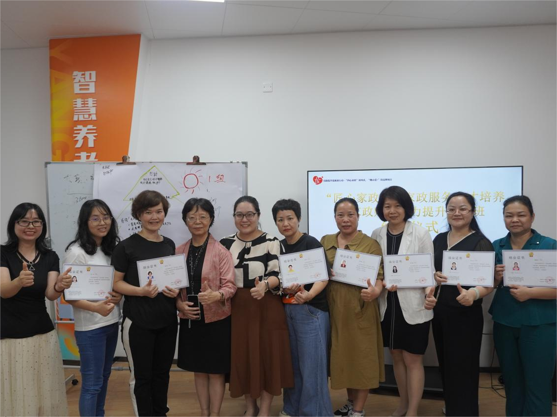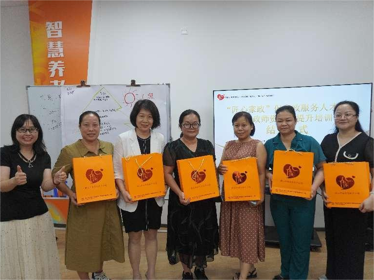 最后,我们在佛山市“南粤家政”产业园举行了一场简单的结业仪式,“匠心家政”项目工作人员为积分最高的小组颁发优秀学员奖品,并为每一个学员颁发了结业证书。至此,“匠心家政”促家政服务人才培养之第一期家政师资培训班圆满结束,期待下一期家政师资培训班学员们的表现!