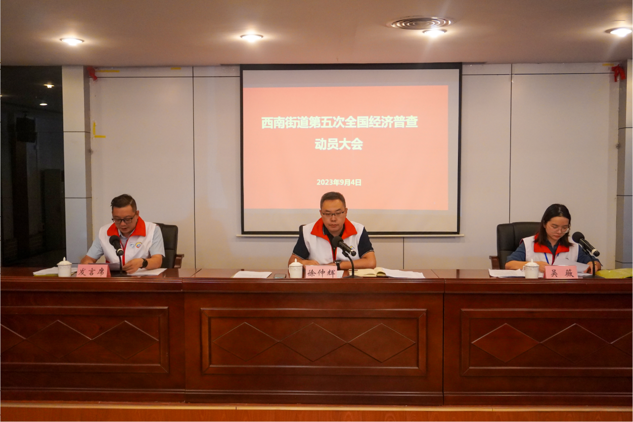 为贯彻落实国家、省、市、区经济普查工作有关会议精神,凝心聚力,铆足干劲,高质量推进西南街道第五次全国经济普查工作,9月4日上午,西南街道召开第五次全国经济普查(以下简称“五经普”)动员大会,西南街道党工委副书记、办事处主任徐仲辉出席会议并讲话,街道办事处副主任吴薇主持会议,街道相关领导班子成员、五经普领导小组成员单位及各村(居)委负责人参加会议。