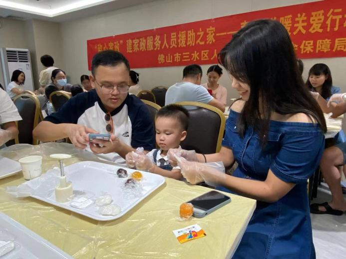 2023年9月24日上午,在三水区人力资源和社会保障局的指导下,“称心家政”建家政服务人员援助之家在芊漫+健康管理中心开展春风送暖关爱行动系列活动之“花好月圆,共聚一堂”月饼亲子DIY课程活动,与15名小儿推拿师、产后康复师及其家庭成员共聚一场,以温情为馅,以快乐为皮,将幸福传递,共同度过中秋前夕。