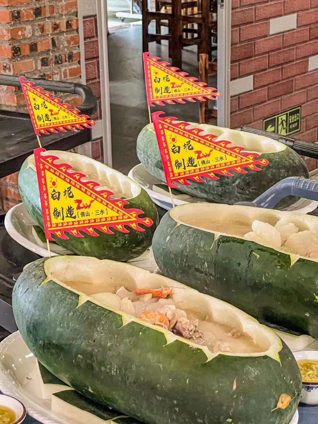黑皮冬瓜船融合白坭传统农作物+西江河鲜,选用国家地理标志三水白坭黑皮冬瓜为食材,配以当地特色西江河鲜熬制而成的生滚西江鱼汤作为汤底,加上冬瓜肉同各种西江河鲜生滚而成,口味鲜美,营养丰富。
