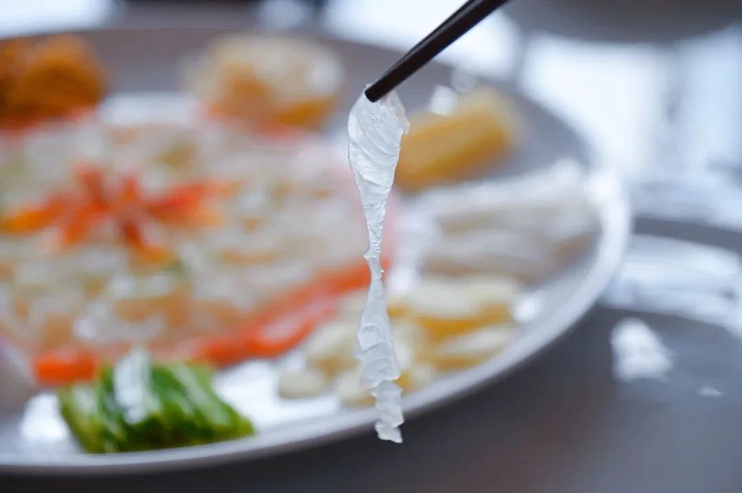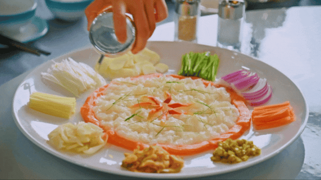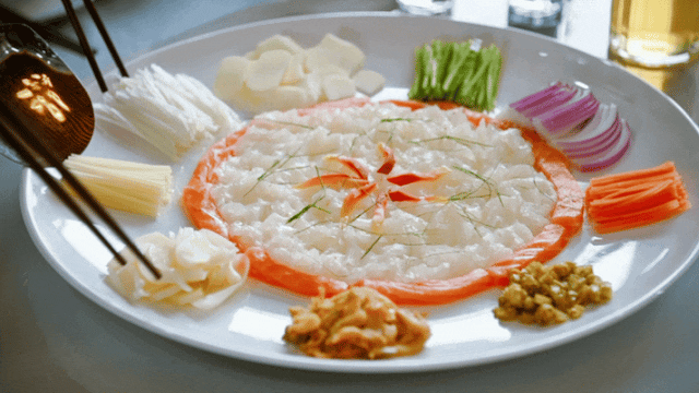鲩鱼生在制作时,先把鱼放血,切成薄如蝉翼的鱼片,每一片都好考究师傅的刀工,再把鱼片晶莹剔透铺在冰盘上,配上各种丰富的佐料。入口后,鲜味缠绕在舌尖,吃出辣、酸、甜、嫩、爽、香等口感,让人回味无穷。
