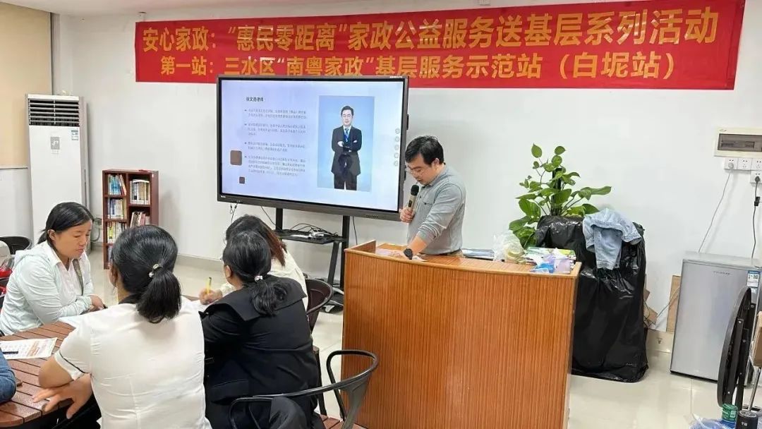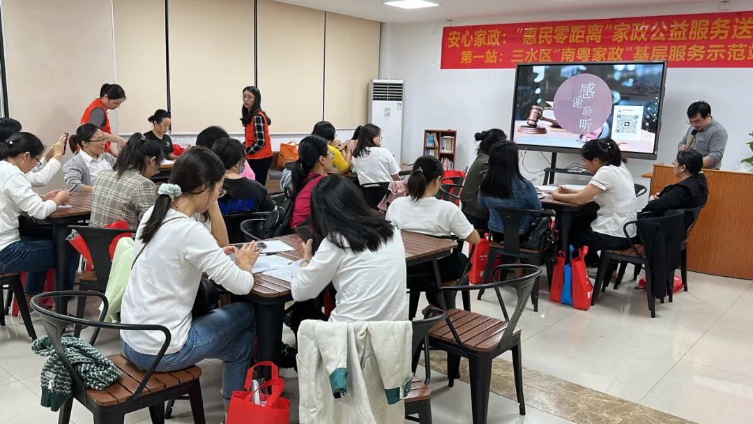 为进一步提升全民法治素养,厚植社会法治文化,营造办事依法、遇事找法、解决问题用法、化解矛盾靠法的氛围,10月20日,在三水区人力资源与社会保障局的指导下,“四心家政“项目工作人员组织开展“惠民零距离”家政公益服务送社区系列活动,第一站我们来到白坭社区服务中心,联动佛山市三水区“南粤家政”基层服务示范站(白坭站)、佛山市三水区白坭镇妇女联合会、佛山市三水区白坭镇妇联妇女儿童权益维护工作站、佛山市广粤家政服务有限公司“妇女微家”、佛山市南粤家政服务超市、佛山市三水区杨耀国职业培训学校开展家政普法公益课堂。