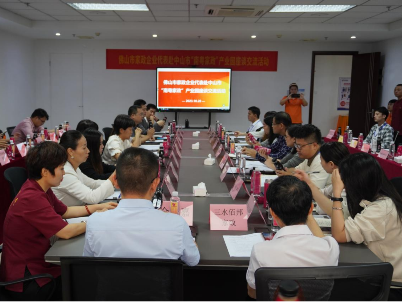 座谈会上,中山市人力资源和社会保障局石歧分局副局长毕亮对佛山家政企业一行表示热烈的欢迎,并对产业园的建设初衷、建设过程、当前经验理念及未来发展规划等作了简单介绍,并期望两地家政企业能互相交流学习,共同进步成长。作为中山市“南粤家政”产业园“大健康+数字家政”发展企业代表艾圣医皇和中数幸福家政产业集团分别就各自企业的特色和亮点作简要介绍,让大家对“大健康+数字家政”的发展模式有了更深入的了解且意犹未尽,期待后续能与之合作。而后,双方代表围绕家政行业如何借助数字化快速转型升级、家政服务如何与大健康更好地衔接、如何通过互联网+家政,实现对雇主和家政人员“精准画像”,一键对接家政服务的“信息高速公路”,实现家政服务需求和供给的精准对接和高效匹配等进行深入交流和探讨。