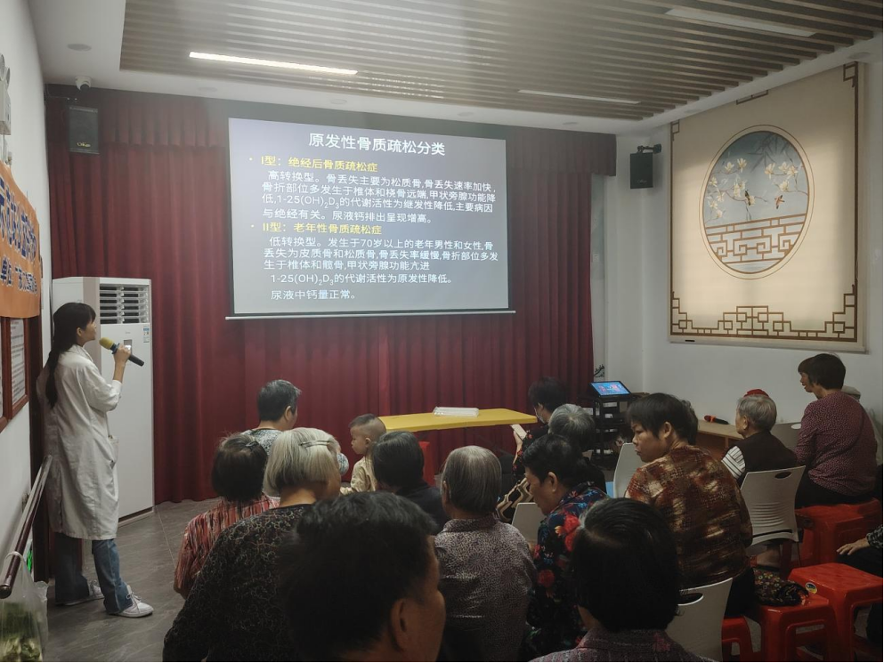 医生通过PPT让大家了解正常的骨骼和骨质疏松的骨骼区别,普及骨质疏松的产生是因为身体里面构成骨的物质减少,骨强度下降,皮质骨逐渐变薄,松质骨的骨小梁逐渐消失,孔隙不断变大及增多,所形成“骨质疏松症”。骨质疏松是一种自然现象,一旦发生骨质疏松性骨折,生存质量下降,出现各种并发症,可致残或致死,因此骨质疏松症的预防比治疗更为现实和重要。希望大家能正确的认识疾病,并积极做好预防治疗。因年龄段及性别等个体差异较大,切勿盲目自行药物治疗,需在专业的医院医师指导下,规范治疗。骨质疏松症的神秘面纱被一点点揭开,骨质疏松症发病很隐匿,可以说是“无声无息”——患者往往等到骨折才知道,且女性比男性多,随着年龄增加,骨质疏松症的患病率亦相继上升。而且骨质疏松症会带来骨折、行动不便、脊椎疼痛及变形等影响。