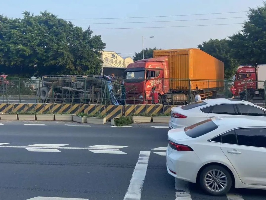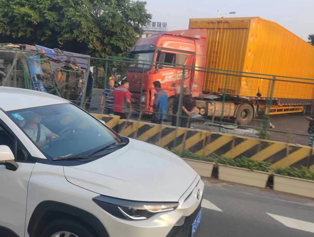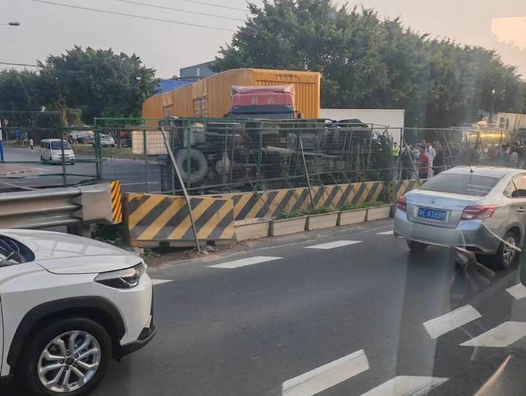 石湖洲佛盛路口两辆大货车相撞,一辆被撞翻!