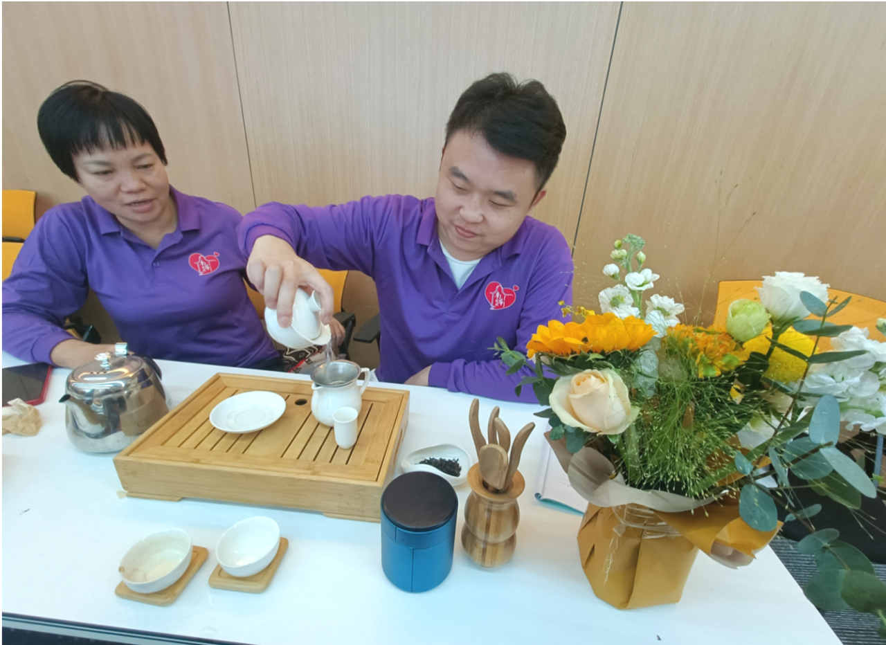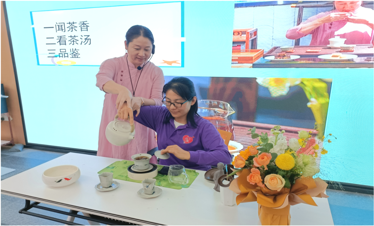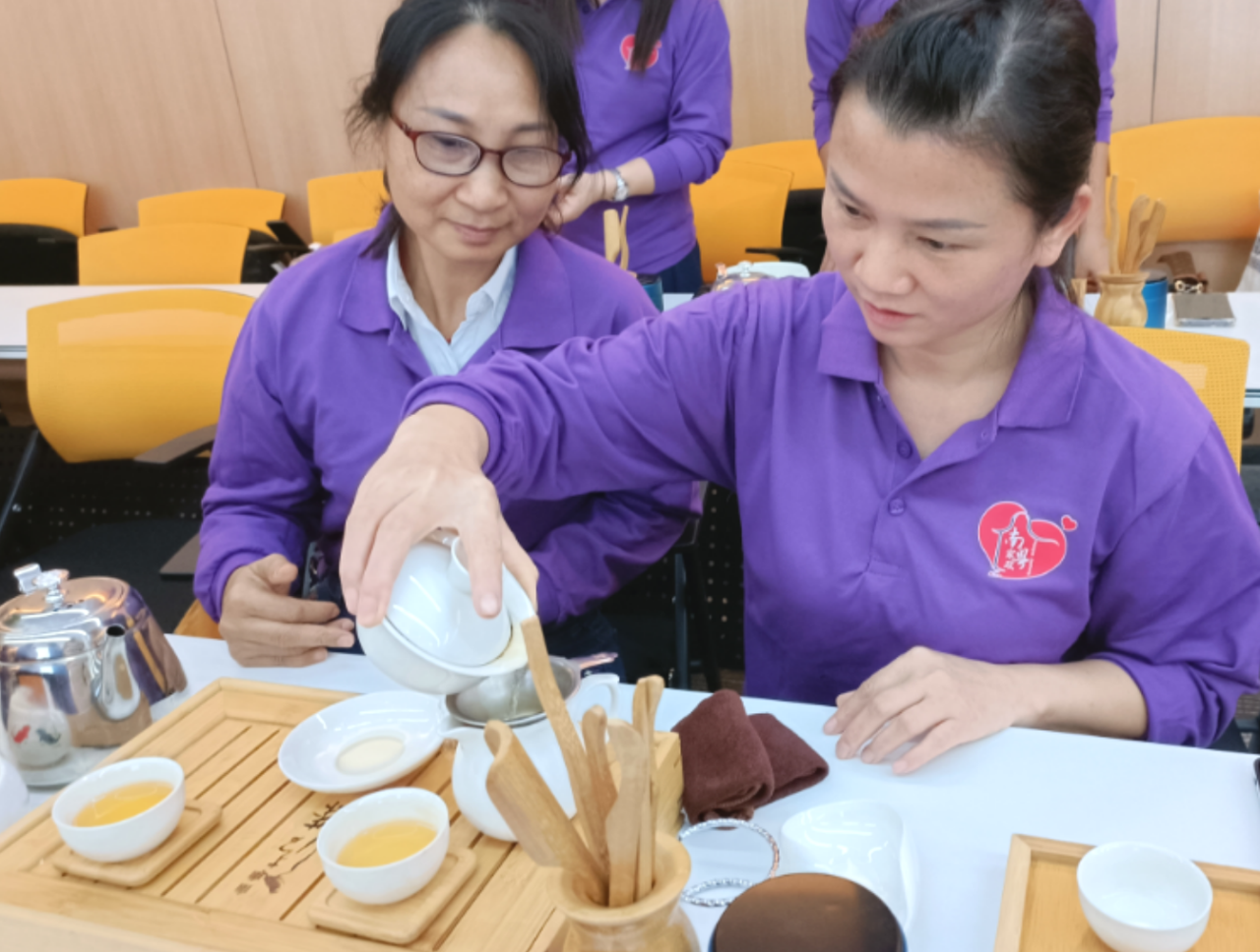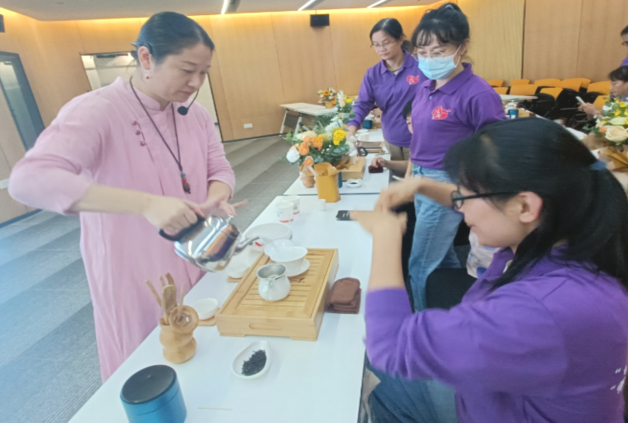 在当天晚上,学员们依旧保持着爽朗的精神状态学习茶艺。茶艺师邓老师在课堂上为学员详细讲解了茶文化、茶的分类与功效,茶具介绍、茶艺冲泡技巧,邓老师为了更好地让学员掌握茶艺冲泡技能,亲自示范并手把手指导每位学员的操作,在老师的指导下,学员们以小组为单位,纷纷动手演练,互相学习。