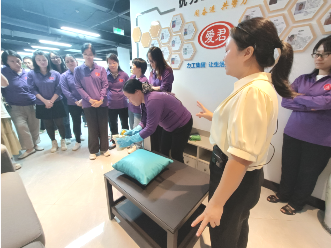培训第三天,家政专业工程师郭老师为学员带来了居家养护知识、不同家具清洁与保养技巧、奢侈品皮包养护技巧等,在郭老师的指导下,学员们拿起工具,有模有样地一一操作,对不同材质的沙发进行清洁与保养、对不同服饰材质有区别地进行清洁,对不同的清洁剂与保养剂的有效使用等。很多学员都说表示,居家家具清洁、服饰养护,尤其是真皮皮包的保养非常需要掌握专业的知识和正确的方法,若错用就会导致一定的损失,也是专业性不强的体现,因此,作为一名专业的高端家庭服务人员,除了掌握扎实的技能之外,还需要拥有不断学习的态度,始终与时俱进,跟随时代的变化,掌握新技能新知识,才能在高端家庭服务这片新蓝海发挥高水准的服务。