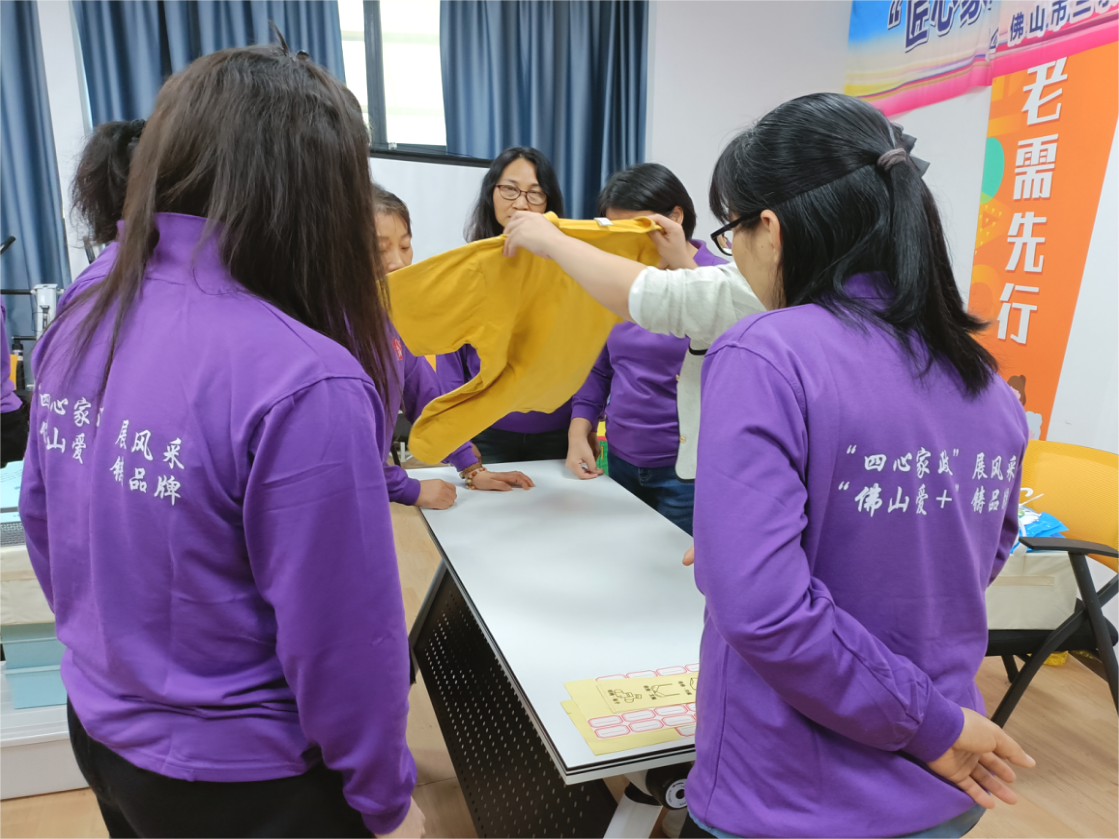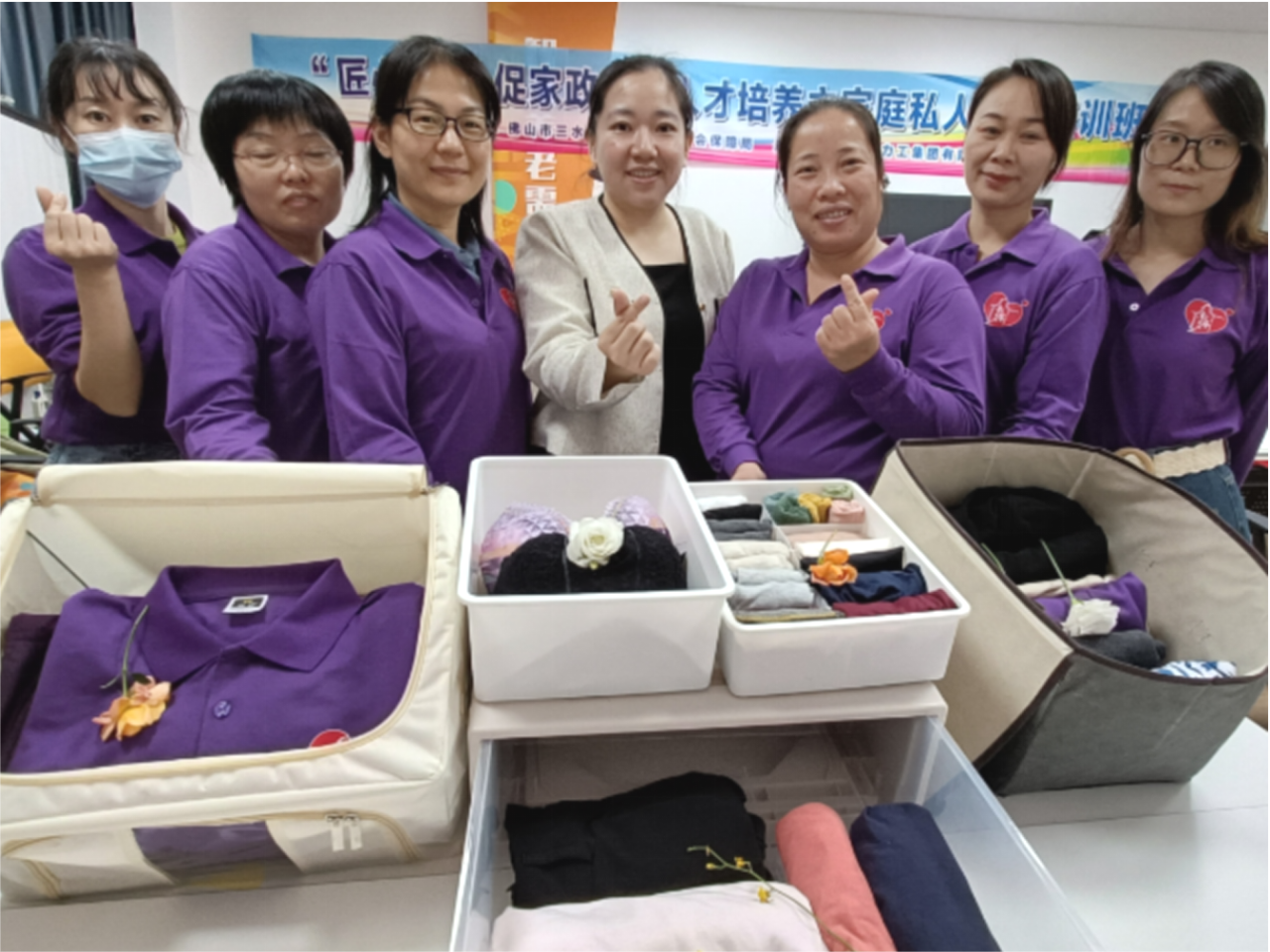 培训第四天也是最后一天,由清职院黄老师为大家带来了整理收纳基础知识、空间规划设计、整理收纳技巧等,在黄老师的指导下,学员们依次动手,将桌面上凌乱的衣物有序整理,根据不同的衣服进行分类、折叠,选取合适的收纳箱进行收纳,并且在课堂上亲自动手设计空间规划平面图,对案例进行分析与提出自己的改造建议等,这堂课除了让大家学到了实用的整理收纳方法,还让我们学到了在生活中,我们要用整理收纳的方式去“清空”烦恼,“整理”生活的美好时光,“收纳”好心情,在将来的生活和工作中,带着美好的家庭服务心态为每一个家庭带去高质量的服务,为推动佛山市家庭服务业走向高质量发展道路上贡献一份力量。