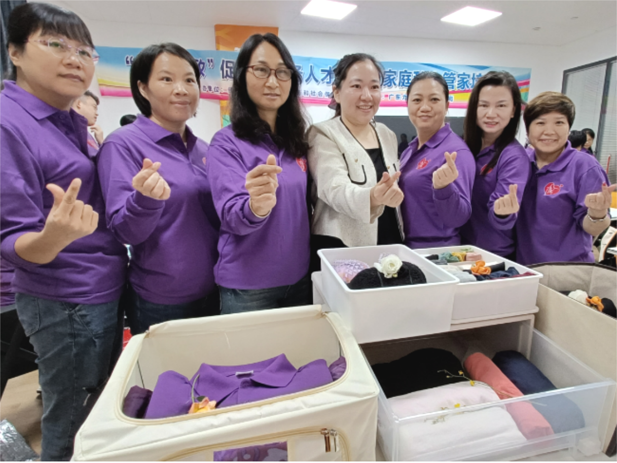 课程结束后,“四心家政”项目工作人员和本期师生在佛山市“南粤家政”产业园举行了结业仪式。在结业仪式上,“四心家政”工作人员为学员进行颁奖和结业证书。至此,为期4天2晚的“匠心家政”促家政服务人才培养之第一期家庭私人管家培训班圆满结束。