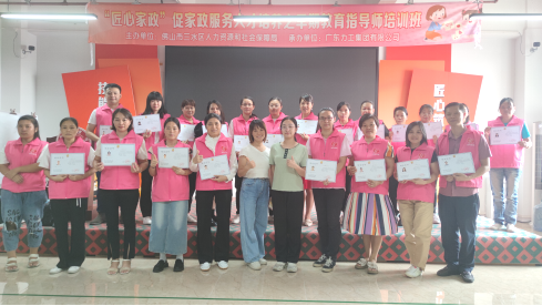 考核完成后,学员们和老师欢聚一堂,大家脸上都挂满了笑容,一起举办了一场温馨的结业仪式,并由黄老师带领学员们表演手语舞“感恩的心”,以表达对市人社、区人社和广东力工集团的感谢。随后,黄老师做了培训总结,期待这些优秀学员能够继续保持优异表现,未来能够为婴幼儿带来开心,让更多的父母了解到早期教育师,将早期教育事业发扬光大。最后,“四心家政”项工作人员和授课老师为班级综合表现优异的学员颁发了奖品及结业证书。至此,“匠心家政”促家政服务人才培养为期五期的早期教育指导师培训圆满结束。