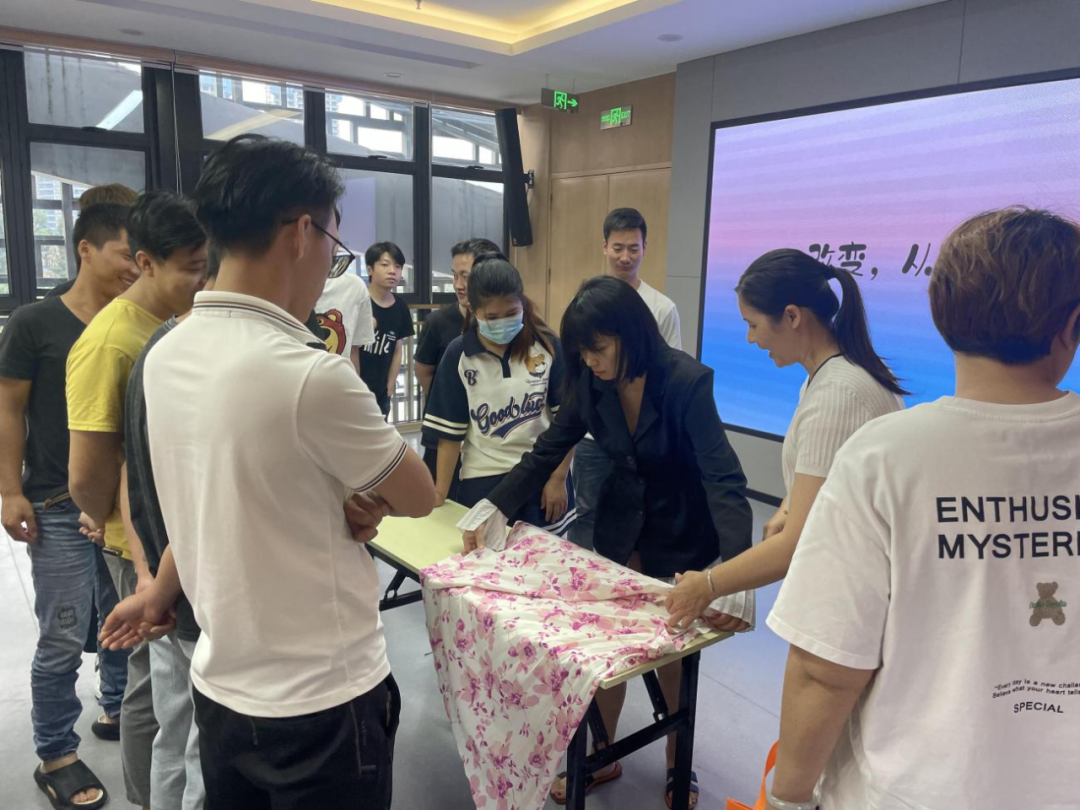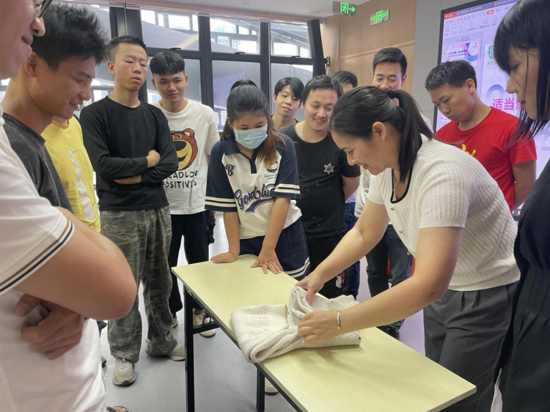 在实操阶段,老师耐心讲解各种衣服的折叠方法,并为大家演示了衬衫、卫衣、西裤、袜子等物品的“口袋式”和“站立式”折叠方法。大家在老师的指导下纷纷拿起衣物实践起来。课堂上,气氛活跃,居民群众不时向老师请教收纳方法,互相交流心得体会。