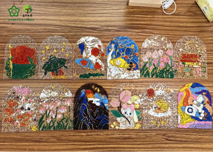 等待颜料风干后,社工为每个小朋友的玻璃画套上一个木质灯光底座,让玻璃画“变身”为生活中常用的物品——台灯,希望这个由小朋友亲手制作的艺术品能陪伴他们成长。
