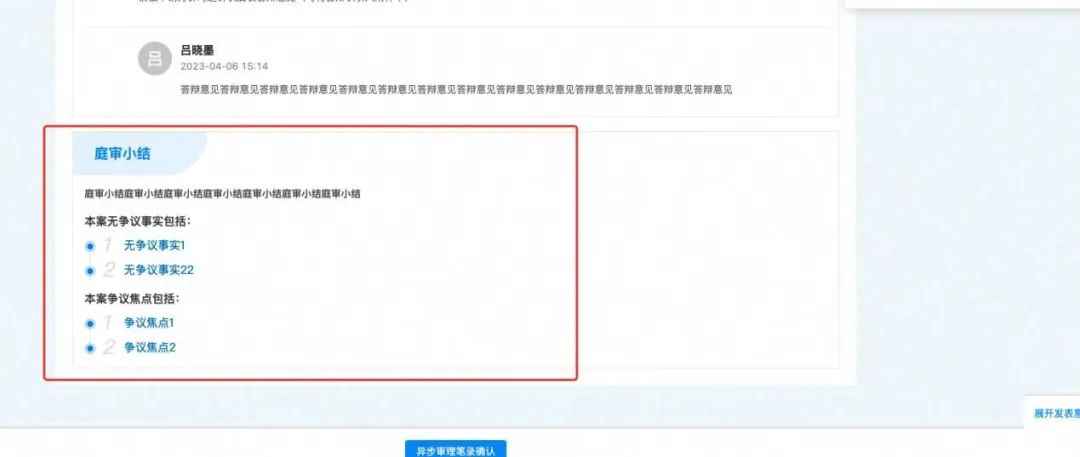 在异步审理环节中,仲裁小助理机器人将自动向当事人发问程序问题,引导申请方陈诉诉讼请求、依据的事实和理由,被申请方针对起诉状发表答辩意见;仲裁小助理机器人会提示申请人和被申请人进行举证、质证和询问,提示申请人和被申请人发表各自的辩论意见。仲裁员可以在任何阶段查看当事人的回答,并对当事人进行询问,归纳庭审小结,所有流程完结后系统自动生成异步笔录,发起当事人网上签名。
