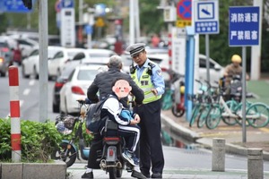 ▲陈建对骑电动车不戴头盔行为进行劝导