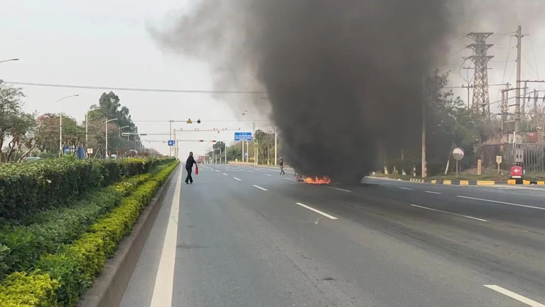 在陈建的组织下,3名警辅人员对现场实施交通管制,疏散附近群众,陈建则带头冲锋,拎起灭火器便往着火的货车跑。他不顾个人安危,用灭火器与“火魔”搏斗起来。此时,完成交通管制及疏散群众工作的3名警辅人员也迅速加入现场灭火。在多个灭火器的喷射下,明火逐渐消失,漫天的黑烟也有所减弱。数分钟后,三水区消防救援大队赶到现场,在陈建及3名警辅人员的配合下,将火势彻底扑灭。