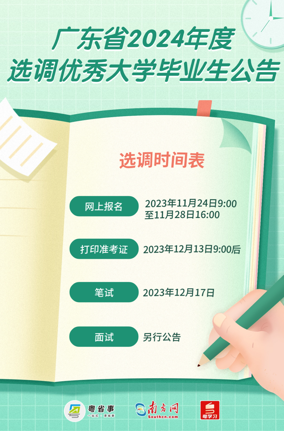 本次选调网上报名时间为11月24日9:00至11月28日16:00。报考者可通过广东组织工作网、广东省人力资源和社会保障厅网、广东人事考试网或“粤省事”微信公众号查阅具体的招考单位、职位、人数和报考资格条件。