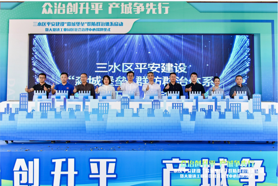 11月28日下午,三水区平安建设“淼城堡垒”群防群治体系启动仪式在大塘镇工业园举办。区委常委、政法委书记孙延驰,副区长、公安分局党委书记、局长叶永辉,副区长、大塘镇党委书记钱静瑜及相关职能部门领导、企业、群众代表,共同将“平安砖”放在“淼城堡垒”上,寓意全社会共同参与,为淼城平安“添砖加瓦”,同时宣告三水区“淼城堡垒”群防群治体系正式启动。